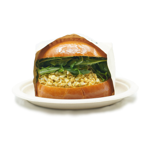 free-range hard cooked eggs and chives mixed in honey mustard aioli, topped with dressed arugula in a warm brioche bun