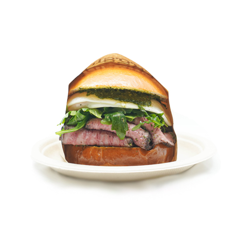 seared USDA prime grade tri-tip, free-range over medium egg, chimichurri sauce, red onions and dressed arugula in a warm brioche bun