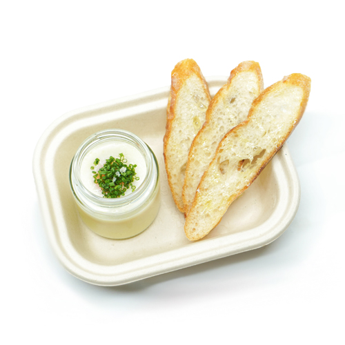 free-range coddled egg on top of house-made potato purée, cooked in a glass jar topped with gray salt and chives, served with slices of baguette